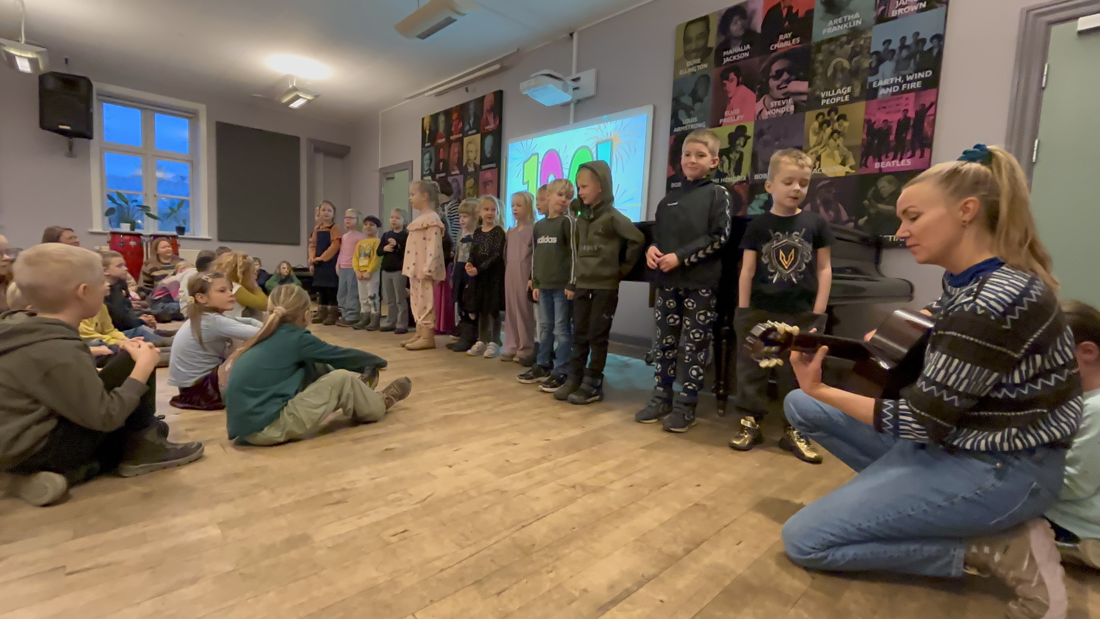 I dag har 0. klasse gået i skole i 100 dage! Det skal selvfølgelig fejres med en 100 dags fest. Her til morgen sang 0. klasse for og med hele skolen.